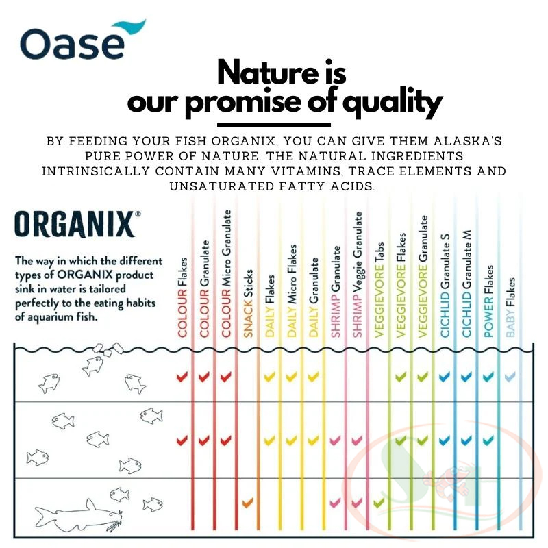 OASE Organix Micro Colour Granulate có kích thước hạt nhỏ (micro) phù hợp cho các dòng cá kích thước nhỏ. Dòng thức ăn OASE Organix sử dụng các nguyên liệu được đánh bắt và thu hoạch bền vững ngoài khơi biển Alaska, không sử dụng các loại kháng sinh, các thành phần sắc tố và caroten tự nhiên được cá sử dụng tối ưu.